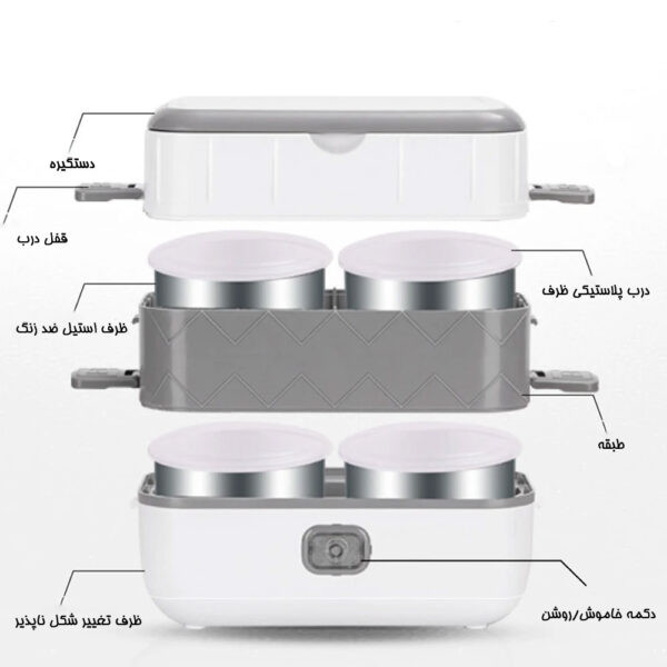 ابعاد تقریبی دستگاه 22*26.5*12 سانتی متر می باشد و گنجایش ظروف استیل مجموعا 2 لیتر است یعنی هر کدام از ظروف آن حجمی در حدود نیم لیتر گنجایش دارد و در کل وزن حدودی دستگاه 1355 گرم می باشد که برای حمل و نقل بسیار سبک و کاربردی می باشد و می توانید در هر کدام از ظروف بخشی از غذای خود را قرار دهید و درب آن را محکم ببندید