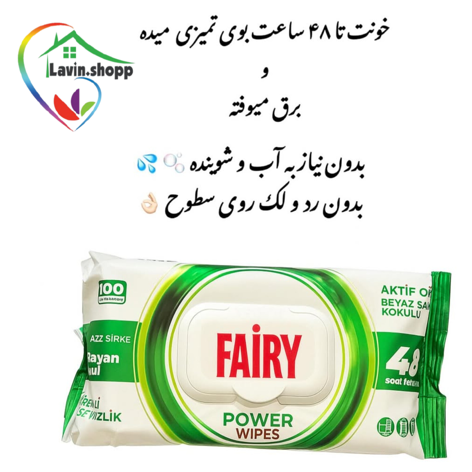 دستمال مرطوب فیری حاوی 100 عدد دستمال مرطوب آماده استفاده برای تمیز کردن انواع سطوح آشپزخانه، سرویس بهداشتی و حمام و اتاقها می باشد